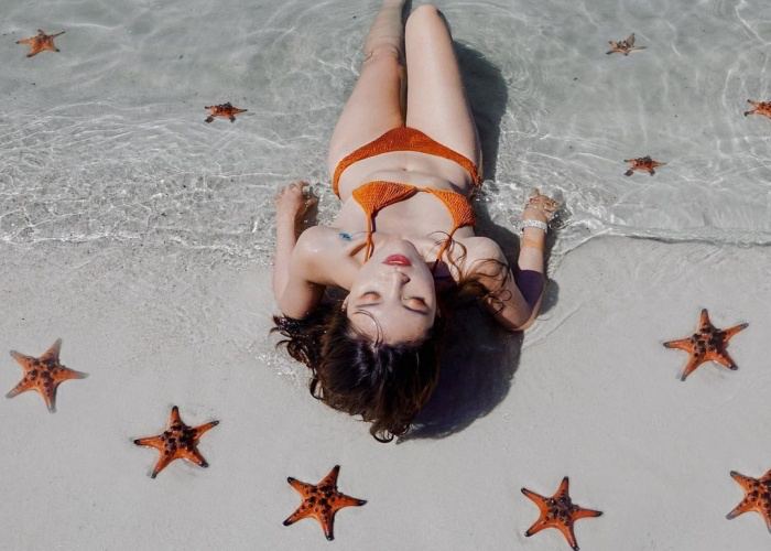 Góc chụp từ trên xuống với sao biển rất đẹp được nhiều du khách lựa chọn. Ảnh: Nam KhánhĐể có những khung hình thật xinh với sao biển, bạn có thể chọn trang phục là váy maxi màu sắc nổi bật như vàng, đỏ hoặc trắng. Tông màu này sẽ cực kỳ nổi bật ở trên nền biển xanh cát trắng. Bạn cũng có thể diện bikini để check-in cùng với những chú sao biển cho ra những khung hình đậm chất nhiệt đới.