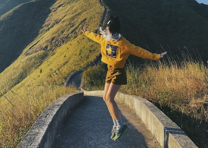 Từ trên cao nhìn xuống, bạn sẽ thấy cung đường đá uốn lượn nhỏ xíu giữa ngọn núi Ngọa Long, đúng chất “Vạn Lý Trường Thành phiên bản Việt”. Điểm thú vị của con đường đá dẫn lên núi là con đường chia thành hai ngã, dẫn lên hai đỉnh khác nhau. Vì thế, đứng ở đỉnh bên này, bạn có thể chụp ảnh được con đường bên kia vô cùng đẹp.