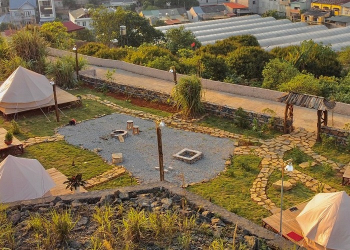 Lần đầu ghé Xanh Camp, bạn sẽ ấn tượng ngay vì nơi này như một khu vườn nhỏ, có những thảm cỏ xanh rì tốt tươi, có những lối đi lát đá sạch sẽ. Ở đó, các khu lều xinh xắn được đặt cách nhau một khoảng vừa đủ để du khách thấy thoải mái khi lưu trú. Vị trí ở giữa khuôn viên là nơi sinh hoạt chung, có chỗ để đốt lửa trại, có chỗ để du khách ngồi chill hoặc ăn uống.