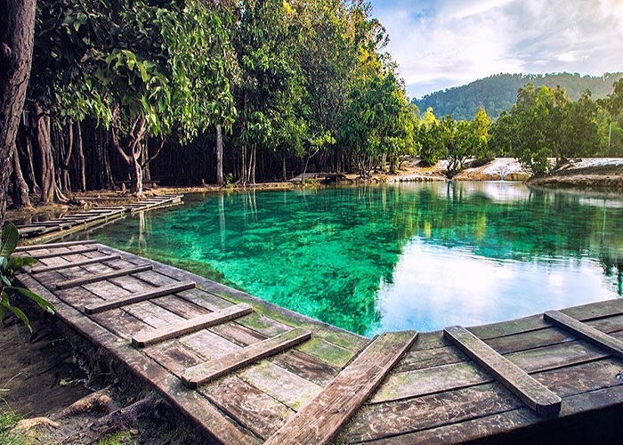 Hồ bích ngọc có thể thay đổi màu nước trong ngàyNgười dân nơi đây gọi hồ này với cái tên “Sra Morakot”, có nghĩa là hồ lục ngọc. Nơi đây đẹp mê hồn du khách với làn nước xanh đến kỳ lạ. Màu nước có thể thay đỏi theo từng thời điểm khác nhau trong ngày. Đặc biệt quá phải không? Đúng là vậy đấy, bạn không hề nhìn nhầm đâu. Khi nhiệt độ tăng cao, nước trong hồ có màu xanh ngọc bích, và khi nhiệt độ hạ dần, nước sẽ chuyển qua màu xanh lơ mát lạnh. Xung quanh hồ Emerald là khu rừng nhiệt đới với những bóng cây bao phủ. Được ngụp lặn dưới làn nước trong vắt màu ngọc bích thì sẽ vô cùng tuyệt vời.