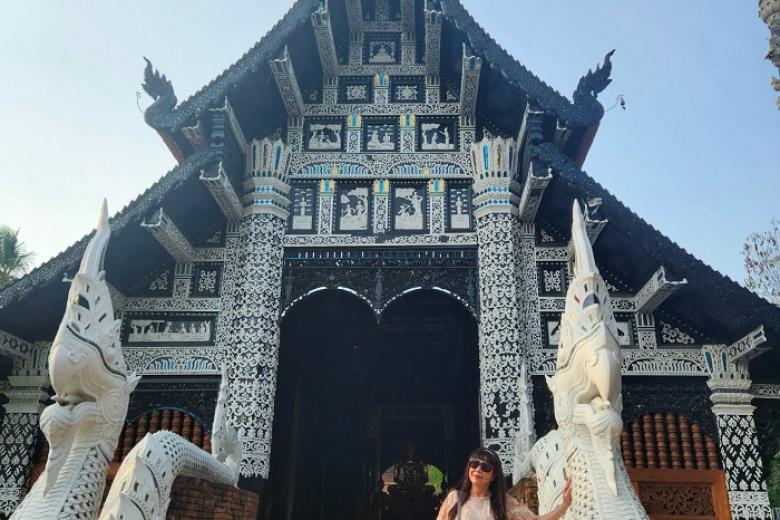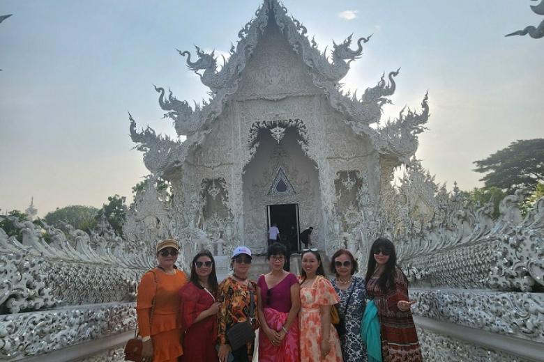 Đoàn tham quan Chùa Trắng - Wat Rong Khun, chùa được ông Chalermchai Kositpipat - họa sĩ và là một trong những kiến trúc sư nổi tiếng ở Thái Lan thiết kế và xây dựng. Ngôi chùa được kết hợp một cách hoàn hảo giữa lối kiến trúc Thái cổ điển với phong cách siêu thực cùng tông màu chủ đạo toàn trắng biểu trưng cho sự tinh khiết của Đức Phật. Bước vào ngôi chùa, bạn sẽ choáng ngợp với vẻ đẹp của màu trắng tinh khiết như có tuyết rơi hiện hữu ở khắp mọi nơi. Bất kể thời điểm nào trong năm, cổng vào của ngôi chùa cũng luôn tấp nập du khách từ khắp nơi trên thế giới.