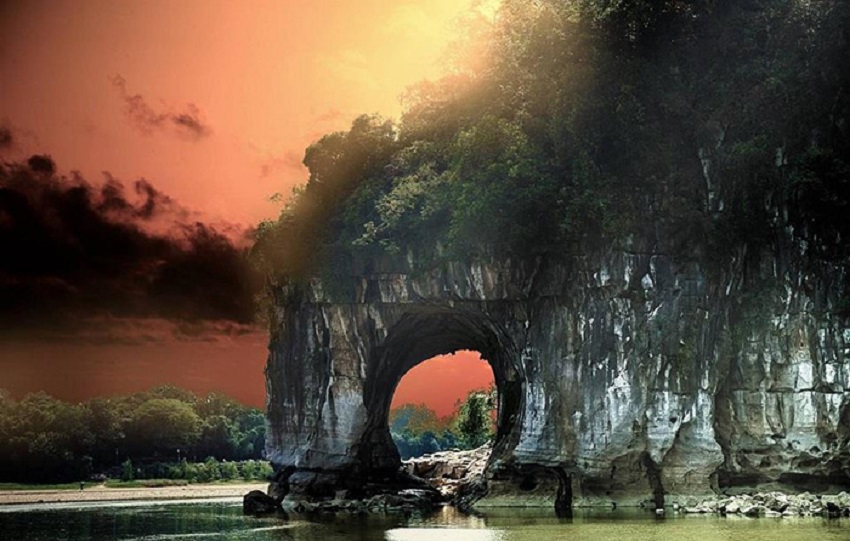 Núi Vòi Voi - Thiên đường hạ giới giữa lòng Quế Lâm Trung Quốc, là một trong những địa danh hấp dẫn mà du khách không thể bỏ lỡ. Cái tên núi Vòi Voi xuất phát từ hình dáng của ngọn núi tựa như chú voi đang nghiêng mình vươn vòi xuống dòng sông Li để uống nước mát lành từ cội nguồn. Nếu quan sát kỹ hơn bạn sẽ nhận ra có một khoảng trống đáng kể ở đoạn giữa thân và vòi voi. Người ta gọi vùng trống đó là động Thủy Nguyệt bởi vì khi đêm xuống, nhất là những ngày có trăng sáng, khoảng trống giữa núi Vòi Voi Quế Lâm tựa như tự phát sáng lấp lánh, soi bóng xuống sông hệt như vầng trăng thứ hai đang trôi bồng bềnh trên sông.