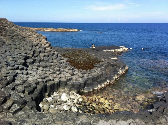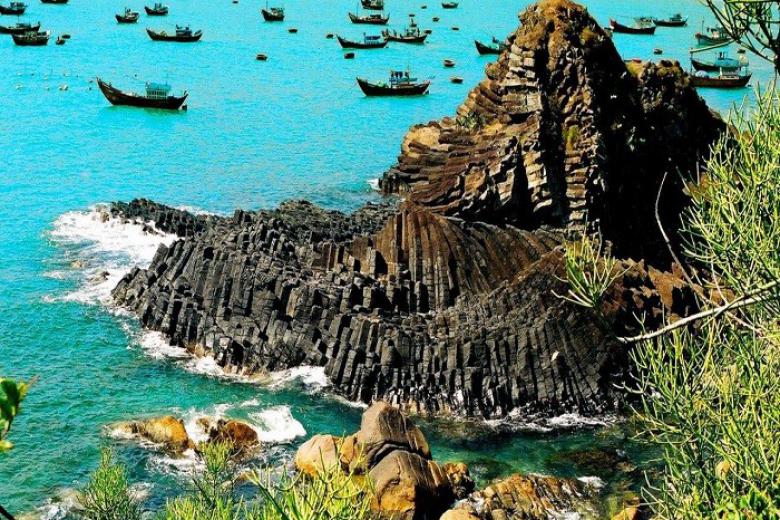 Tiếp tục cuộc hành trình, quý khách sẽ tham quan thắng cảnh cấp quốc gia Gành Đá Dĩa – là một tập hợp các trụ đá hình lăng trụ xếp liền nhau, hòn nọ nổi hòn kia kề với sóng nước. Bãi đá trải rộng san sát nhau chung màu đen huyền bí. Có trụ thẳng đứng, có trụ nghiêng vẹo nhưng vẫn chồng chất tầng tầng trông như chồng bát dũa nên có tên gọi là Ghềnh Đá Dĩa.