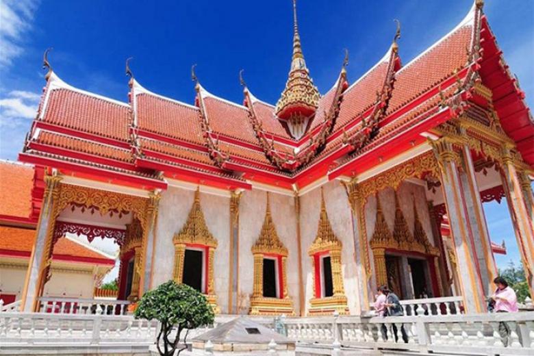 Tour du lịch Thái Lan 4 ngày, đoàn du khách đến đền Chalong - ngôi đền là một biểu tượng Phật Giáo không thể thiếu khi đến với Phuket. Tại đây có bày bán các sợi dây cầu may được chính các vị sư trong chùa làm phép để mang lại bình an cho gia chủ.