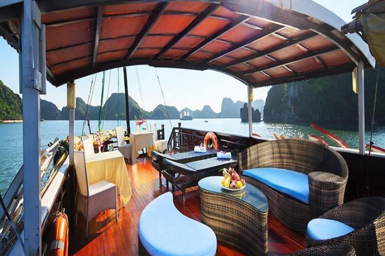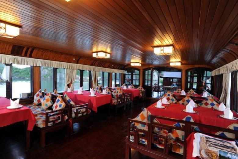 12h30: Quý khách sẽ dùng bữa trưa trên du thuyền. Vừa thưởng thức những món ăn mang hương sắc của biển cả quý khách vừa có thể thưởng lãm những cảnh quan thiên nhiên hùng vĩ của vịnh Hạ Long.