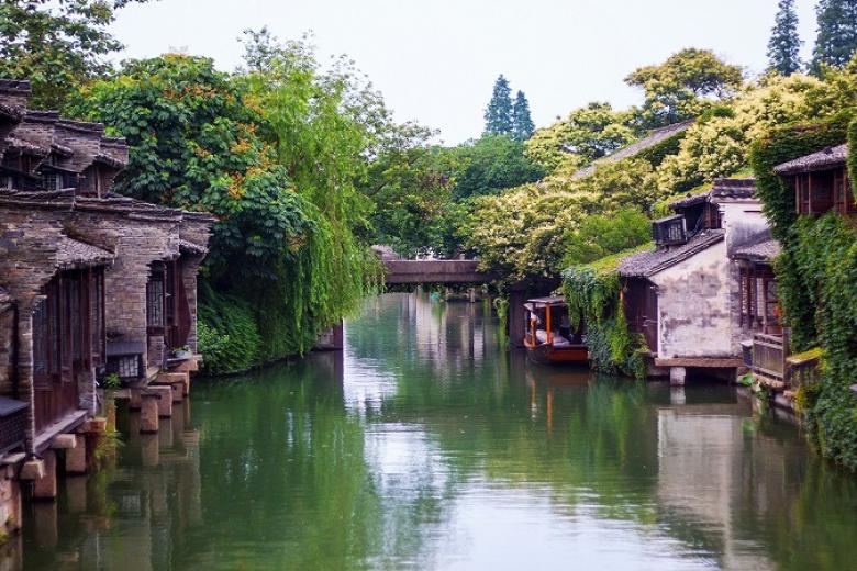 Sau đó đoàn khởi hành đi Ô Trấn - là một trong sáu thị trấn cổ nổi tiếng nhất vùng Giang Nam, được mệnh danh là “Venice của phương Đông”. Với hơn một nghìn năm lịch sử, Ô Trấn giữ nguyên vẻ đẹp cổ kính của những con đường lát đá, mái ngói rêu phong và dòng kênh xanh biếc len lỏi quanh làng. Những cây cầu đá cong cong, ngôi nhà gỗ cổ kính soi bóng xuống mặt nước tĩnh lặng tạo nên khung cảnh trữ tình, nên thơ. Đến Ô Trấn, du khách như được quay ngược dòng thời gian, hòa mình vào nhịp sống yên bình, thưởng ngoạn cảnh quan sông nước hữu tình và khám phá nét văn hóa đặc sắc của vùng Giang Nam trầm mặc.