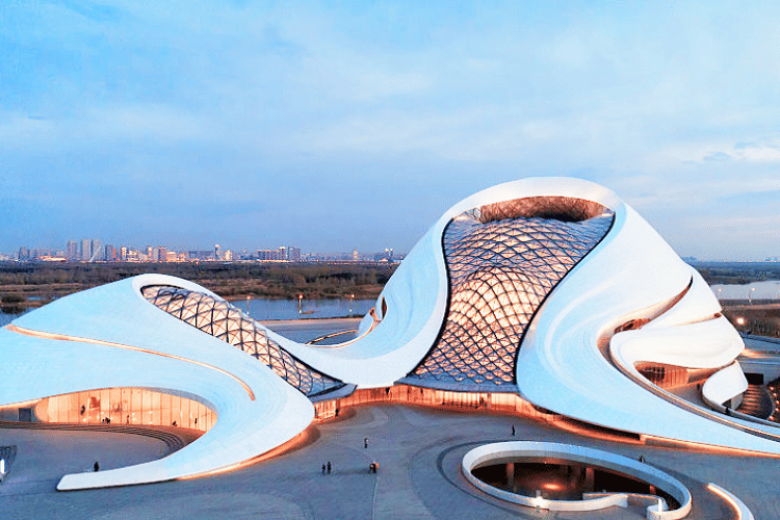 Nhà hát lớn Cáp Nhĩ Tân do công ty MAD lên ý tưởng thiết kế và xây dựng, là một công trình kiến trúc độc đáo có hình dạng giống như một con tàu vũ trụ. Với khung cảnh tuyệt đẹp của dòng sông Tùng Hoa uốn lượn xung quanh, nhà hát trở thành một địa điểm lý tưởng thu hút du khách đến với thành phố Cáp Nhĩ Tân, phía Bắc Trung Quốc. Các kiến trúc sư sử dụng những tấm nhôm trắng được uốn cong một cách đẹp mắt phủ bên ngoài nhà hát, tạo được sự đồng điệu cho công trình với dòng sông Tùng Hoa uốn lượn bên cạnh.