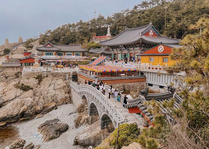 Ngôi chùa được xây dựng từ năm 1376, mang đậm dấu ấn kiến trúc Phật giáo Hàn Quốc, nổi bật với cổng đá Tam Quan, tượng Phật Quan Âm cao lớn và các bậc thang uốn lượn dẫn xuống biển. Đặc biệt, vào những dịp lễ như Phật Đản, chùa được trang trí hàng nghìn chiếc đèn lồng rực rỡ, tạo nên không khí lung linh khó quên.