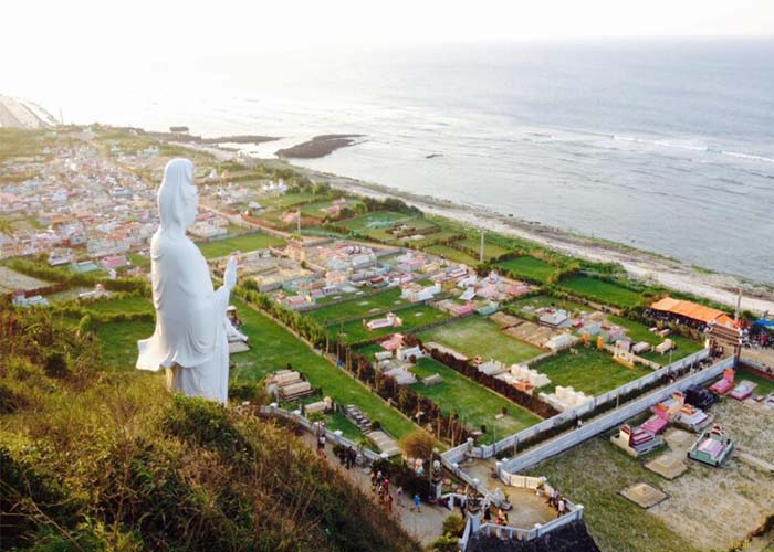Không chỉ dừng lại ở đó, từ chốn thiêng liêng này, toàn cảnh huyện đảo Lý Sơn trải rộng như một bức tranh thủy mặc sống động. Những cánh đồng tỏi xanh mướt trải dài theo triền đồi xen lẫn với những ngôi làng nhỏ bình dị và những bãi biển trong xanh như ngọc bích tạo nên một khung cảnh vừa lãng mạn vừa hùng vĩ. Sự kết hợp giữa đất trời, biển cả và cảnh vật mang lại cảm giác thư thái, thanh thản đến lạ kỳ, khiến lòng người như được gột rửa khỏi mọi muộn phiền.