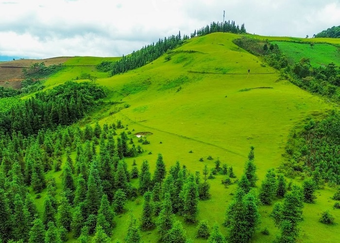 Điểm nhấn của thảo nguyên tươi tốt này còn là những cây thông tuyệt đẹp sinh trưởng và phát triển rất tốt. Từ trên cao nhìn xuống, bạn sẽ thấy những cây thông vươn mình lên trời. Loại thông có phần ngọn càng ngày càng nhỏ, hệt như cây thông mùa Giáng Sinh được trang trí cẩn thận. Màu xanh của thông, màu xanh của cỏ hòa quyện vào nhau, tô điểm cho bức tranh nơi đây thêm phần tươi mát.