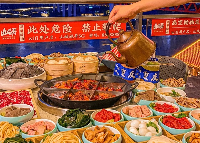 Không gian nhà hàng rộng rãi, đặc biệt có thể ngắm nhìn cảnh sông Dương Tử tuyệt đẹp vào buổi tối. Món lẩu tại nhà hàng có vị cay đặc trưng của Trùng Khánh với các loại gia vị như: ớt, tiêu Tứ Xuyên và sa tế.