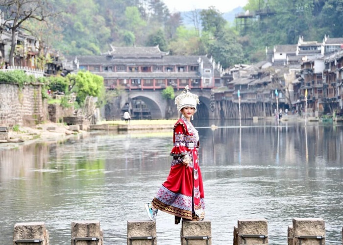 Phượng Hoàng Cổ Trấn đẹp cổ kính. Ảnh: traveloka Sáng: Tham quan các địa điểm nổi tiếng ở Phượng Hoàng Cổ Trấn như: Lầu Miêu Tử , Cầu Hồng Kiều và các khu di tích văn hóa trong thành phố.