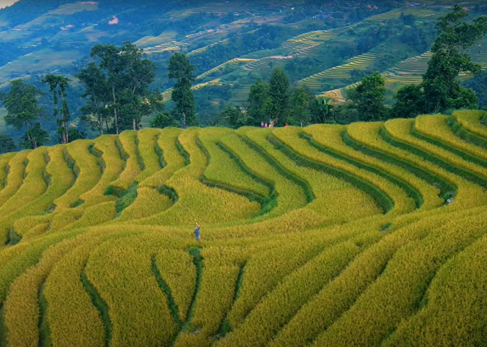 Ruộng bậc thang Lùng Vài, nơi mà tới đây du khách sẽ hoàn toàn choáng ngợp trước một màu vàng trải dài tới tận chân trời, lúa vẫn còn chưa gặt, đang độ óng vàng trĩu hạt.